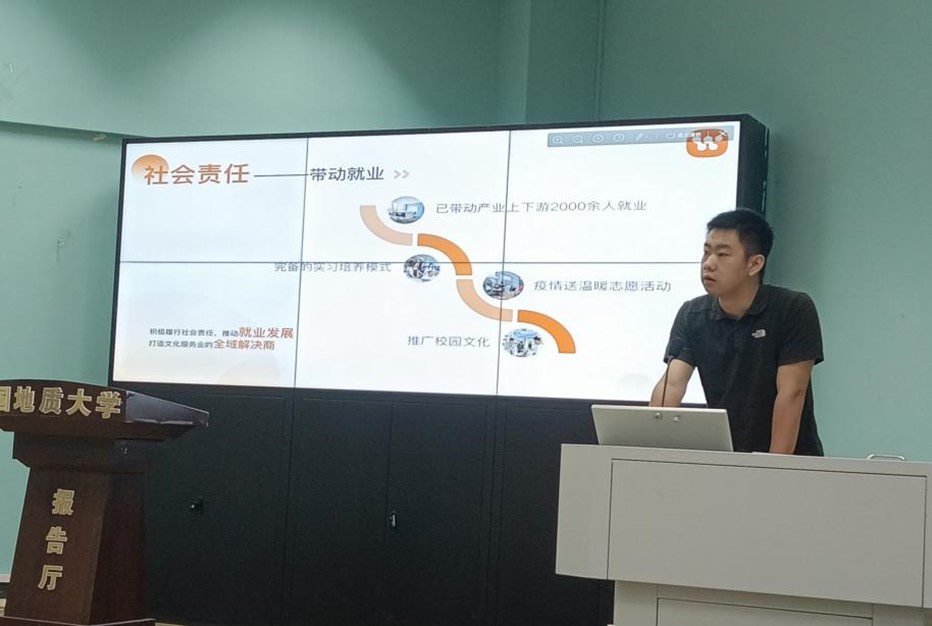 然后,我校艺术与传媒sunbet申搏官方网站大四员工李乐介绍了他创办的武汉松木文化科技有限责任公司的基本情况,包括公司结构、主营业务和社会责任等,并具体说明了该公司如何在文创链方面进行创新,如何在地大校园打造“地心引力”这一高校文创品牌更好地服务广大师生及校友,如何依托公司实际运营业绩积极备战“互联网+”、“三创赛”,这些都引发了同学们的积极思考。