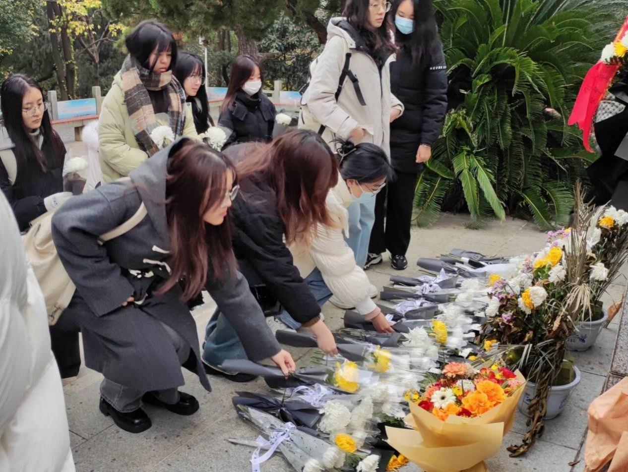 (图为同学们上前献花)