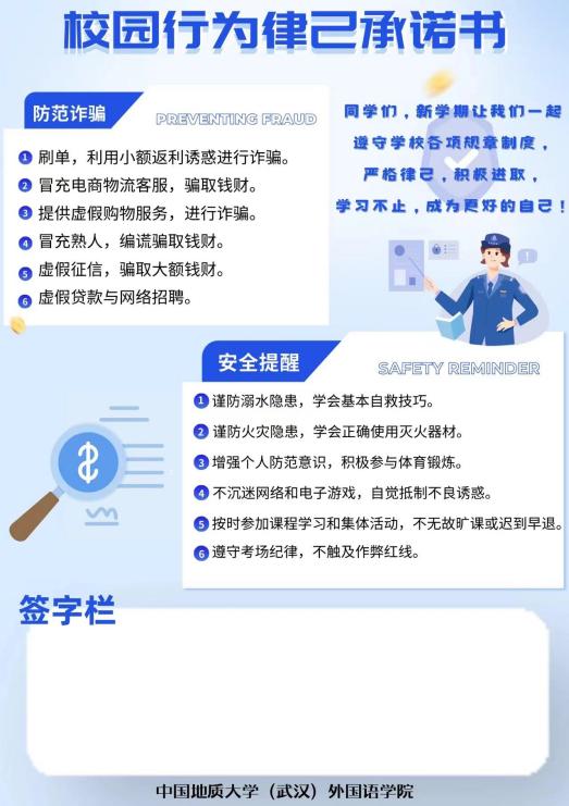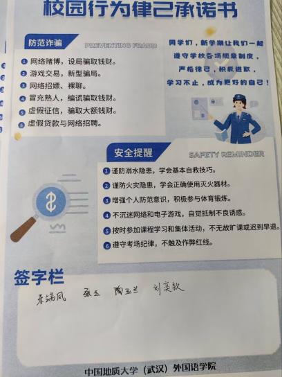 本次活动全面覆盖了外院学子所在的每一个寝室,以校园行为律己承诺书为载体,传达了学员对外国鱼们的关心和爱护。sunbet申搏官方网站首先提醒同学们预防溺水事故,谨防火灾隐患等,增强员工安全意识和自我保护意识,鼓励员工积极参与体育锻炼,全面发展。除此之外,本次活动强调了遵守学校规章制度,有意识规范自身行为,自觉抵制不良诱惑的重要性。