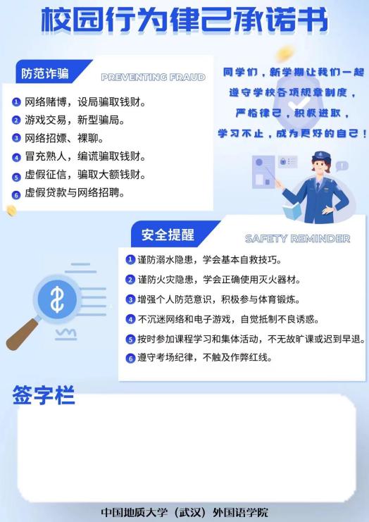 此次寝室发放校园律己行为承诺书活动,以其独特的形式和显著的效果,赢得了广大师生的一致好评。这份载满期望与关切的承诺书为同学们的学习与生活提供动力,也在同学们心中播种下的安全教育的种子。