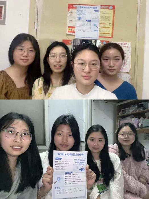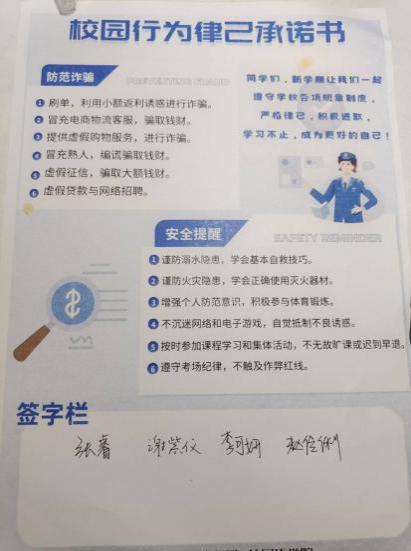 各班同学踊跃参与本次活动,校园律己行为承诺书发放到寝室后,同学们以寝室为单位进行承诺书的研读和学习探讨,明确了新学期学习生活律己要求,熟读每一条反诈提示与安全建议,进行了深入的反思与学习,并郑重的在承诺书签字栏处留下签名。
