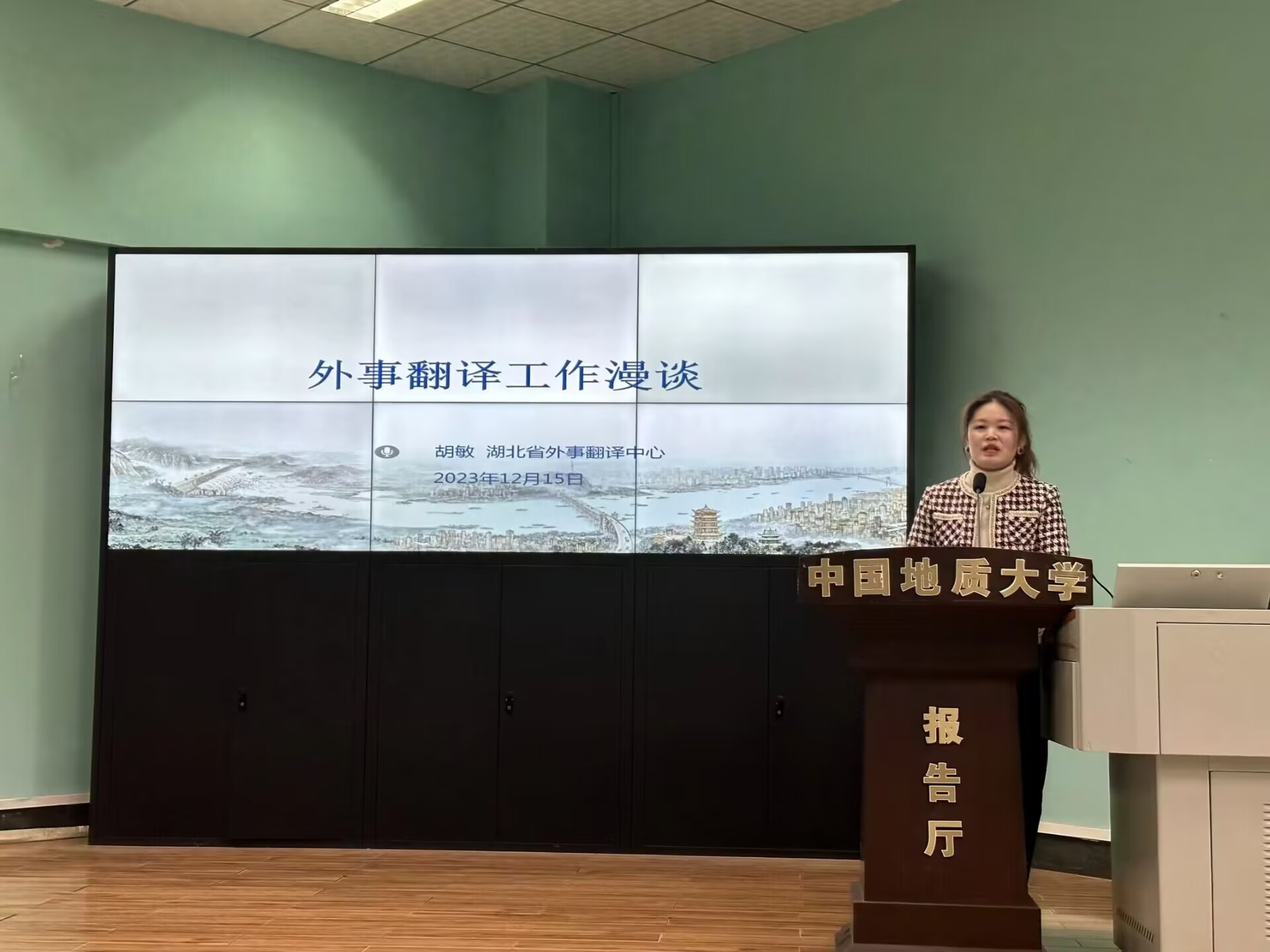 2023年12月15日上午9时00分,sunbet申搏官方网站“南望今声”外语论坛系列讲座第60期在北一楼120学术报告厅举行。主讲人湖北省外事翻译中心英语翻译胡敏女士,应邀开展了主题为“外事翻译工作漫谈”的精彩讲座。此次讲座由sunbet申搏官方网站杨红燕副教授主持,八十余名师生参会。
