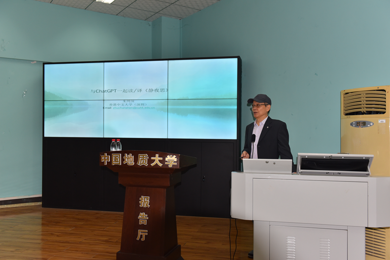 2024年10月18日上午10点,sunbet申搏官方网站(武汉)“南望今声”外语论坛系列讲座第67期在北一楼120学术报告厅举行。香港中文大学(深圳)人文社科sunbet申搏官方网站朱纯深教授应邀来到sunbet申搏官方网站,给外院师生带来了一场主题为“与ChatGPT一起读/译《静夜思》”的精彩讲座。此次讲座由张伶俐副院长主持,参会师生共计100余人。
