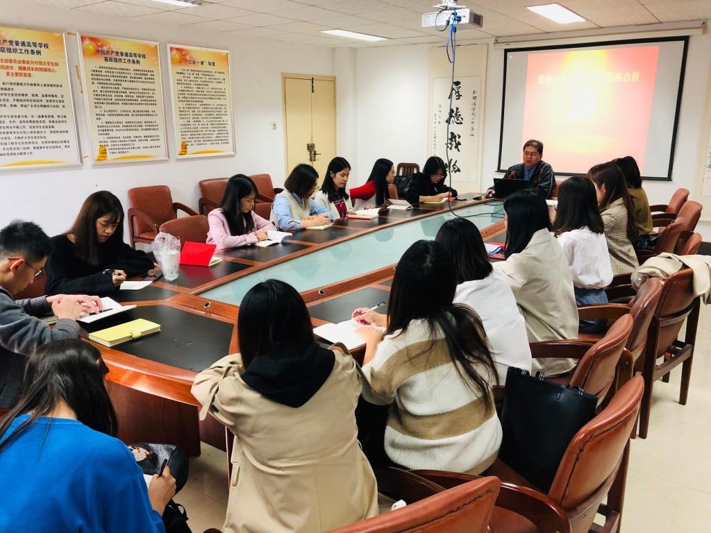 2019年10月29日下午2:30,sunbet申搏官方网站“不忘初心·牢记使命”主题教育系列党课在北一楼339正式开讲,sunbet申搏官方网站党委副书记胡文勤为全院研究生党员讲授了题为“坚持社会主义,增强道路自信”的党课。