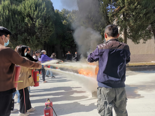 讲座之后,胡文勤老师带领与会同学在学校安全保卫部消防科老师们的指导下,在室外实地演练了干粉灭火器的灭火过程。