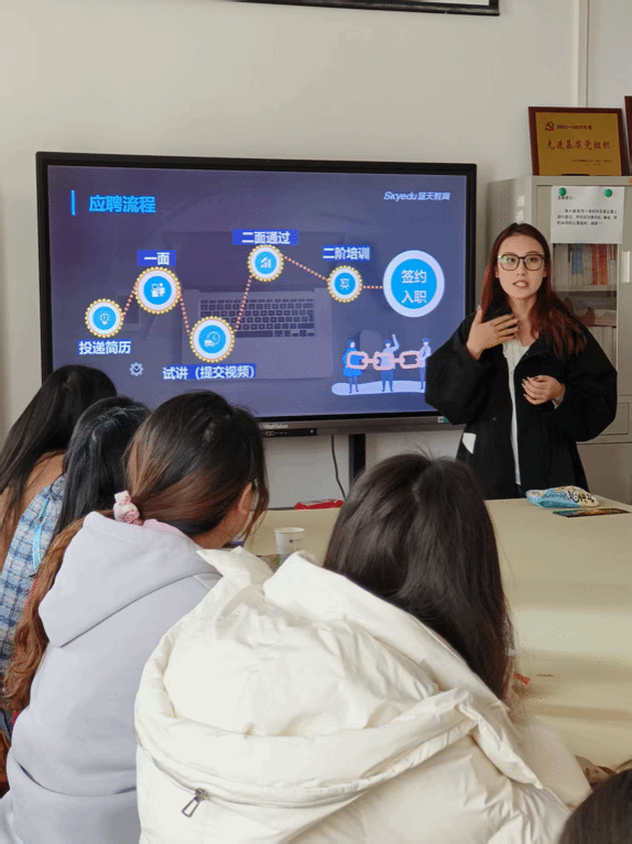 宣讲会上,两位HR首先分享了毕业后加入深圳蓝天教育的职业发展历程。她们以职场新人的视角切入,讲述了自身如何通过充分规划和持续学习逐步成长为优秀英语员工的发展经历。随后,她们详细介绍了此次深圳蓝天教育的招聘信息、企业文化、培训体系以及职业发展路径,让与会同学们加深了对蓝天教育集团的了解和期待。