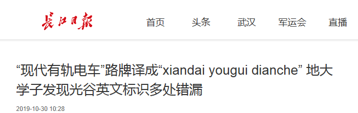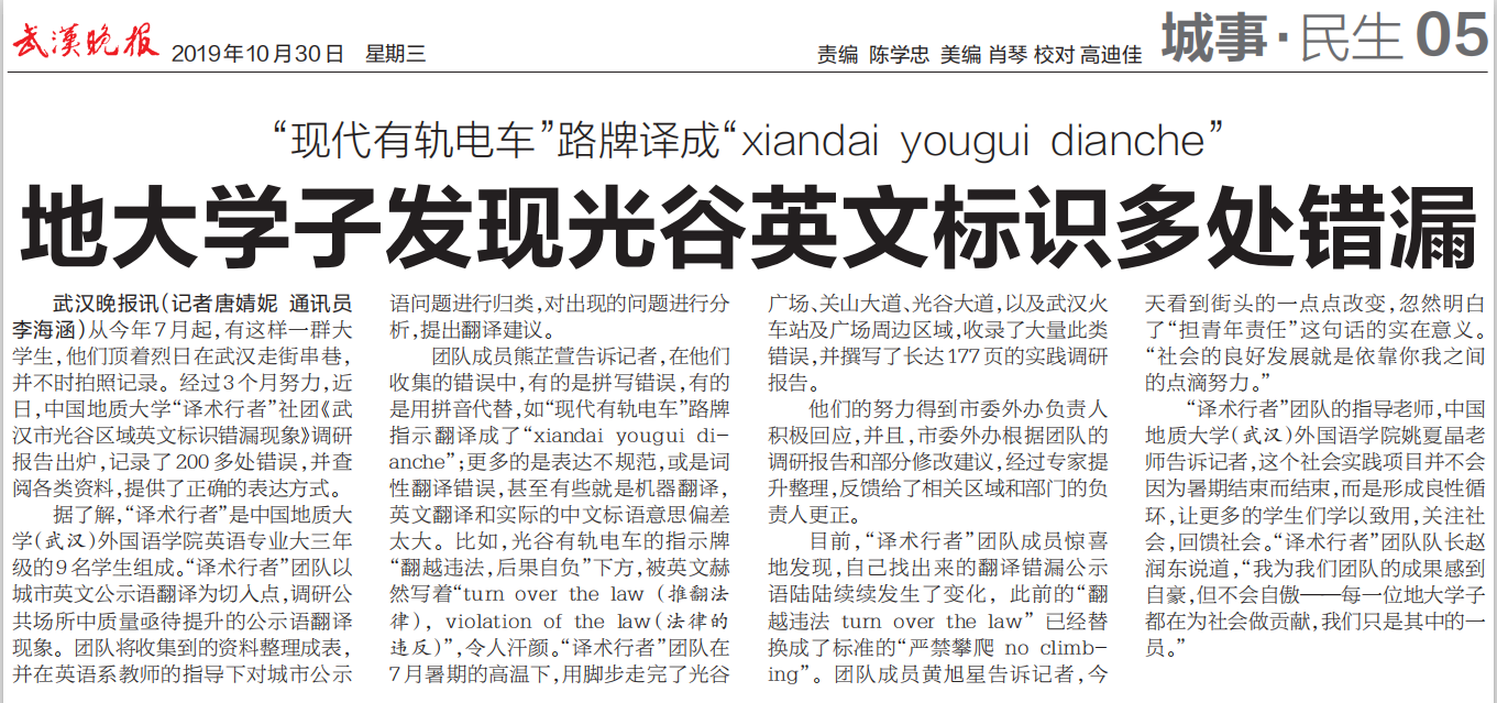 (通讯员 赵润东)2019年10月30日,长江日报和武汉晚报接连报导sunbet申搏官方网站暑期社会实践团队“译术行者”2019年暑期针对武汉城市英文标识的调研,11月1日,武汉电视套四套“经视新看点”栏目对团队成员、指导老师以及sunbet申搏官方网站领导进行了专题采访。