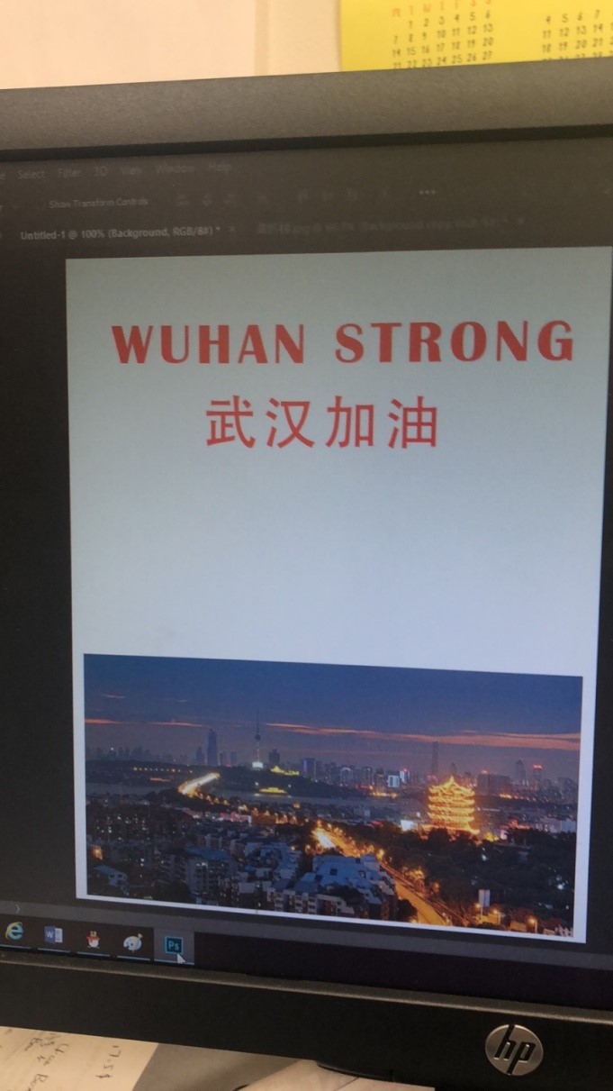 为了能够购买更多的医用物资,我们商量后决定再向阿尔弗莱德大学以及周边社区发起捐款的活动。于是我开始搜集各种资料,制作了一个“武汉加油”的视频以及一张签名海报,在一个晚会活动上,我们给来参加活动的教职工、员工和社区居民播放了视频,并向观众们介绍了武汉人们众志成城、抗击疫情的情况,讲述了地大(武汉)教职工积极努力,支持帮助近500名国际员工的生动事迹。