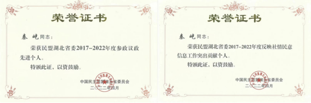 (通讯员:戴薇)近日,sunbet申搏官方网站员工、民盟地大委员会秦屹在民盟湖北省委会召开的“矢志不渝跟党走、携手奋进新时代”政治交接主题教育动员大会上获得“2017-2022年度参政议政先进个人”“2017-2022年度反映社情民意信息工作突出贡献个人”荣誉称号。