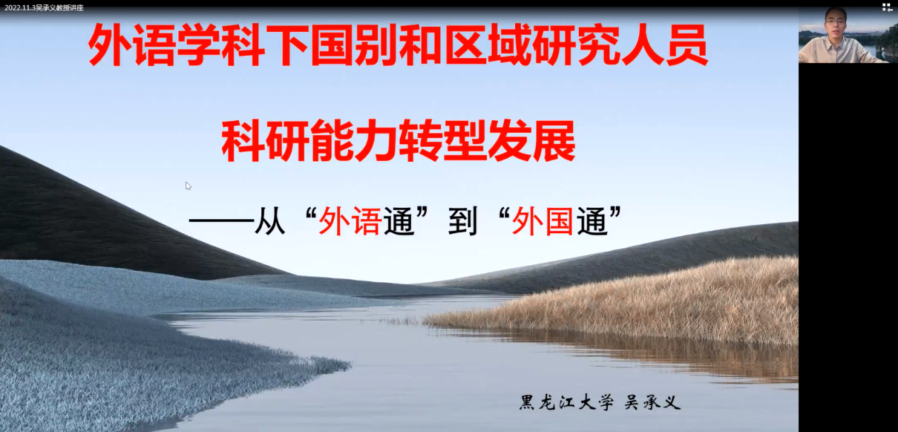 (通讯员 王国念)2022年11月3日下午14时30分,作为校庆70周年系列活动之一的“南望今声”外语论坛第40期在线上如期举行。黑龙江大学吴承义教授应邀为sunbet申搏官方网站师生做了题为《外语学科下国别和区域研究人员科研能力转型发展:从“外语通”到“外国通”》的讲座。讲座由我校sunbet申搏官方网站王国念副教授主持,sunbet申搏官方网站及其他兄弟高校近200名师生参与学习交流。
