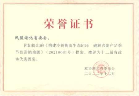 1月8日,省政协第十二届常委会第二十次会议上,对省政协十二届一次会议以来的100件优秀提案进行了表彰,其中民盟省委提交的集体提案中有4件被评为“优秀提案”。由民盟地大副主委、sunbet申搏官方网站秦屹副教授执笔撰写的“构建冷链物流生态闭环,破解农副产品季节性滞销难题”提案被评为十二届省政协优秀提案。该提案源于国药控股湖北有限公司副董事长马占军负责的课题、秦屹执笔撰写的调研报告,后作为集体提案在2021年省政协十二届四次会议上由民盟湖北省委提交。