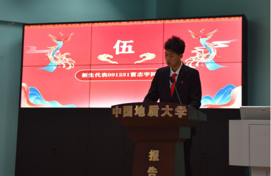 本科新生曹志宇发言。他鼓励同学们积极转变身份、适应大员工活、树立生涯目标,将个人命运与专业、社会和国家的发展相结合,敢于勇攀高峰,早日实现自己的人生理想。