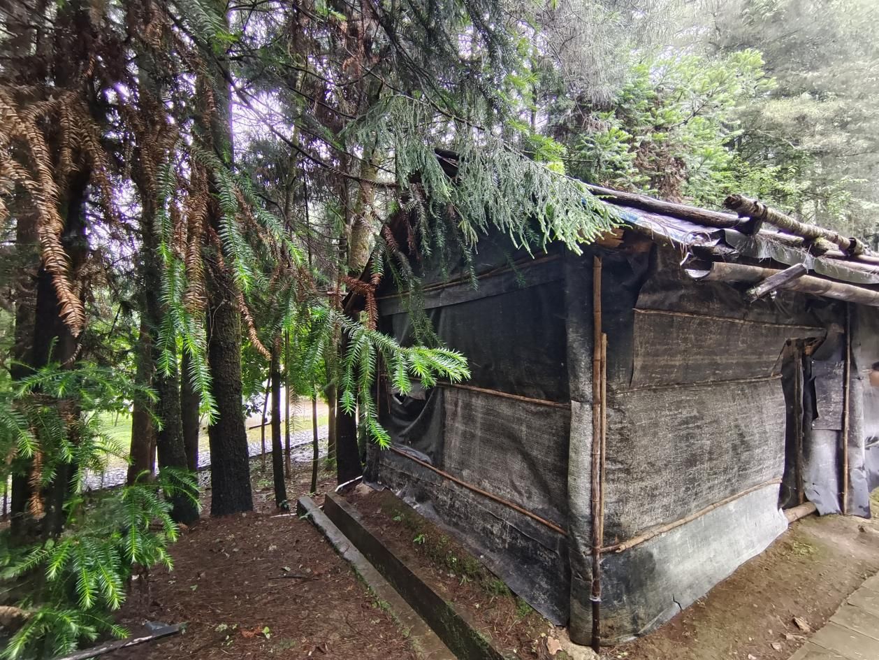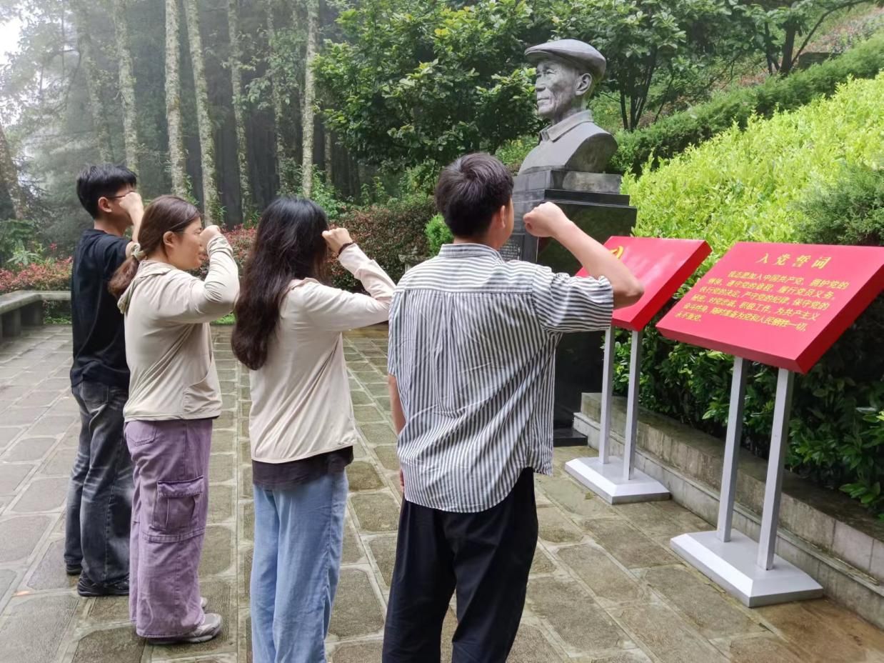 抵达善洲林场后,实践团成员与老师首先踏入了杨善洲事迹陈列馆。馆内一幅幅珍贵的照片、一件件生动的展品,无声地诉说着杨善洲同志平凡又伟大的一生,将大家带回了那个与干部群众同吃同住同劳动的年代。从领导岗位退下后,他拒绝了城市的舒适生活,毅然决然地回到大亮山,以山为家,以树为伴,用双手铸就了一片绿色的奇迹。杨善洲同志不辞辛苦、兢兢业业、克己奉公的形象跃然眼前,让每一个人都深受触动。杨善洲同志的一生是奋斗的一生,是无私奉献的一生,他的事迹是共产党人精神的光辉典范。随后,实践团成员和老师怀着沉重而崇敬的心情,步入了杨善洲墓园。在庄严的墓碑前,全体师生党员怀着崇高的敬意面向党旗庄严宣誓,重温入党誓词结束后,大家面向杨善洲同志的雕像默哀、三鞠躬,默默缅怀这位伟大的共产党人。墓园内的“碑林”上,镌刻着党和国家领导人对杨善洲的高度评价以及他一生为官为人的动人事迹,让大家深刻体会到了杨善洲同志淡泊名利的高尚情操,感受到了杨善洲同志忠诚于党、忠诚于人民的崇高精神境界。走进老场部,简陋的条件让人难以想象这里曾是杨善洲同志带领大家规划蓝图、运筹帷幄的地方。墙上悬挂的老照片、桌上泛黄的文件,无一不在讲述着那段艰苦创业的历史,让大家了解到杨善洲同志是如何在极其有限的条件下,带领群众克服重重困难,将荒山变为绿洲。进入老窝棚,这座简陋的住所见证了杨善洲同志20余年如一日坚守大亮山植树造林的艰辛历程。抬头可见的千疮百孔的油毛毡屋顶、四处灌风的树桩篱笆墙、熏得漆黑的茶壶和口缸……这一切都让大家深切感受到了杨善洲同志艰苦朴素、实干苦干的行为作风。每个人的心灵都受到了强烈震撼,对于“自讨苦吃”的善洲精神有了更深一层的理解。