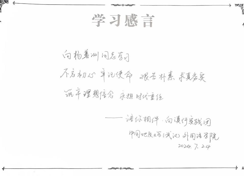 忠诚是善洲精神的核心与源泉。杨善洲同志一生忠于党、忠于祖国、忠于人民,这是他终生奋斗的精神支撑。无论在岗还是退休,他都坚定不移地听党话、跟党走,始终保持共产党员的政治本色。为民是善洲精神的本质体现。杨善洲同志始终把人民利益放在第一位,尽心竭力为老百姓办实事、解难事、做好事。他深入基层,了解群众疾苦,时刻惦记着群众的安危冷暖,真正做到了权为民所用、情为民所系、利为民所谋。善洲精神不仅是对杨善洲同志个人品德的高度概括,更是新时代党员干部的精神灯塔,它揭示了党员干部党性修养的基本内涵,符合党的建设的现实需要,大力弘扬善洲精神对于坚定党员干部理想信念、提升党性修养、推动科学发展具有重要意义。善洲精神是一种宝贵的精神财富,它激励着广大党员干部不忘初心、牢记使命、砥砺前行。在社会主义现代化建设的新征程中,全体实践团师生要大力传承和弘扬善洲精神,踔厉奋发、勇担复兴使命,为实现中华民族伟大复兴的中国梦贡献自己的青春力量!