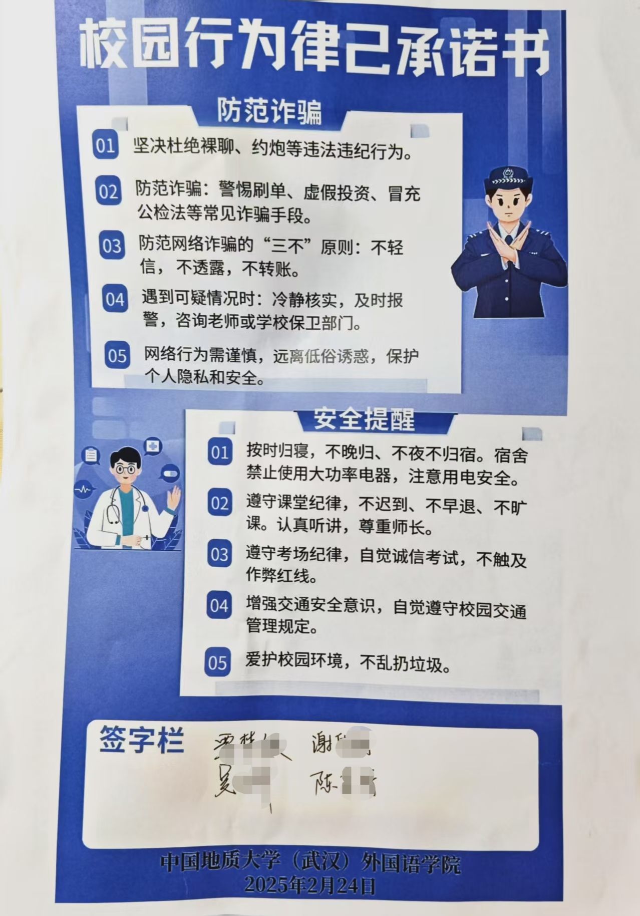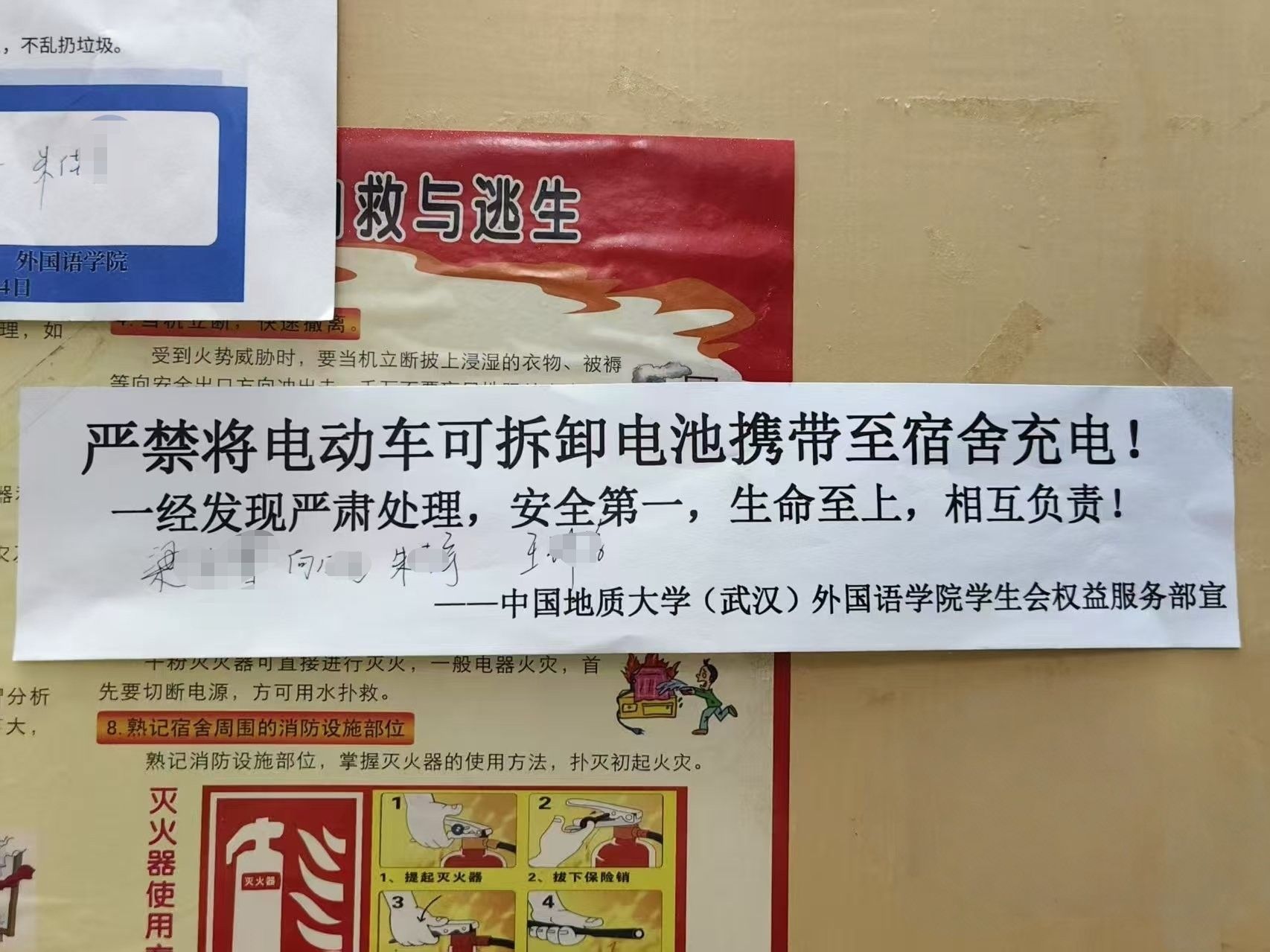 此外,sunbet申搏官方网站特别制作电动车消防安全提示,以宿舍为单位开展电动车安全承诺接力活动。各宿舍集体学习电动自行车充电规范后,在提示条上签署姓名,实现安全责任“到寝到人”。