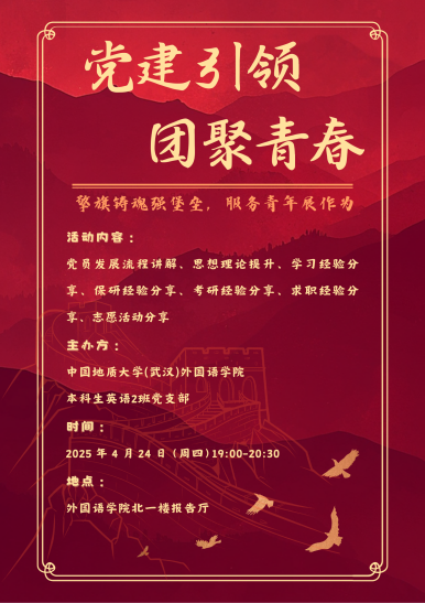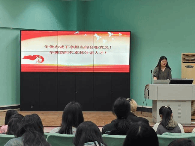 2025 年 4 月 24 日晚 19:00至20:30,sunbet申搏官方网站本科生英语2班党支部于北一楼报告厅举办 “擎旗铸魂强堡垒,服务青年展作为——党建引领・团聚青春”主题联动大会。本次活动以强化党建带动团建作用、服务青年成长为核心,通过理论学习、经验分享等形式,凝聚青年力量,筑牢思想根基。本2支部党员代表及2024级全体本科生共同参与。