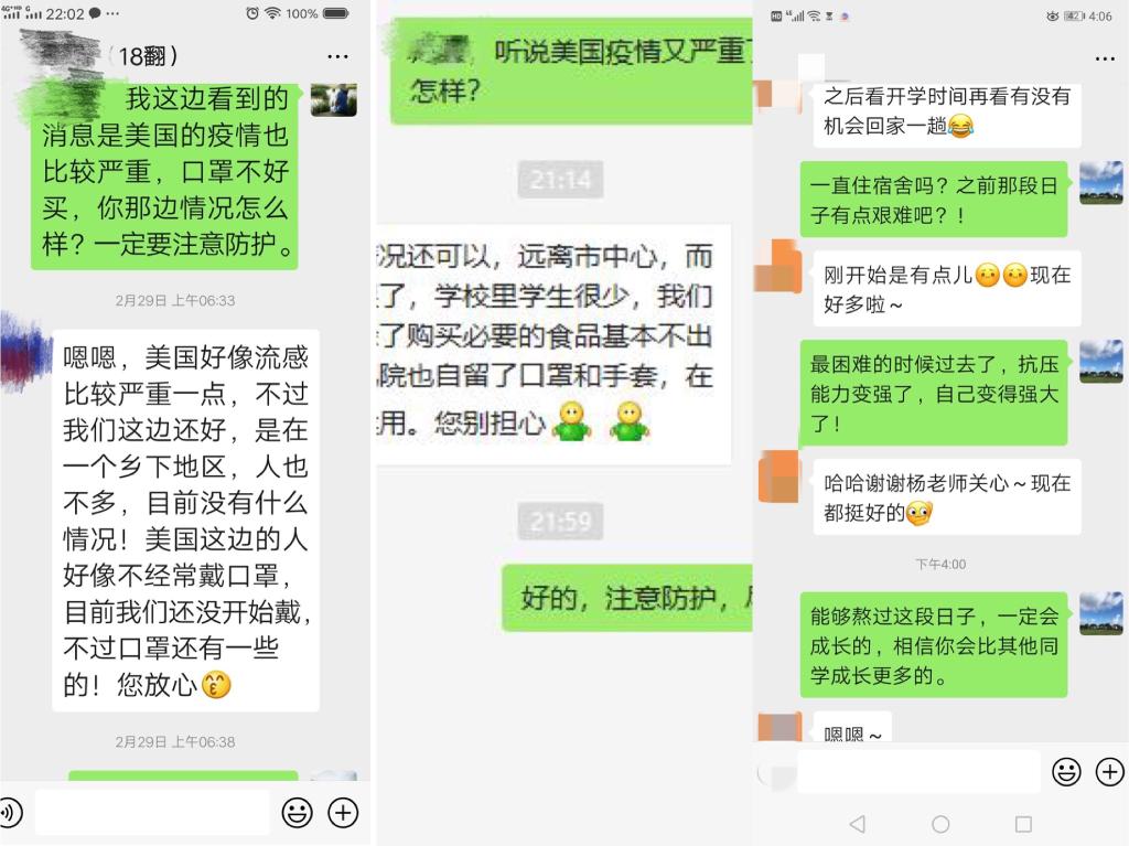 王伟老师的一个员工在美国孔子sunbet申搏官方网站做汉语志愿者,在得知美国疫情加重之后,王老师经常与员工联系,提醒员工加强防护。杨红燕老师的一个员工整个寒假都留在学校,在疫情最紧张的时候杨老师一直与其保持联系,关注其生活是否有困难,鼓励她坚强成长。