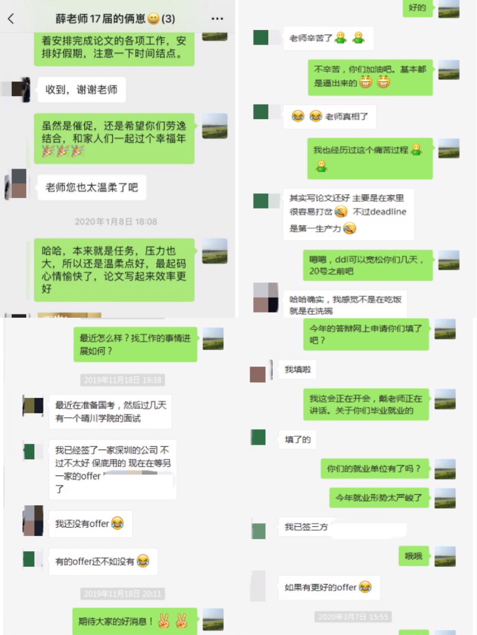 薛菊华老师今年有两名即将毕业的研究生,同样面临着毕业论文写作和找工作的双重考验。其中一位员工在武汉封城前随父母回到了重庆老家,没有办法回来,查找资料和论文写作困难重重,而另外一名员工到目前还没有找到合适的工作。作为她们的导师,薛老师经常与她们轻松交流,温柔敦促,通过自己的亲身经历来进行鼓励,以缓解她们的压力。
