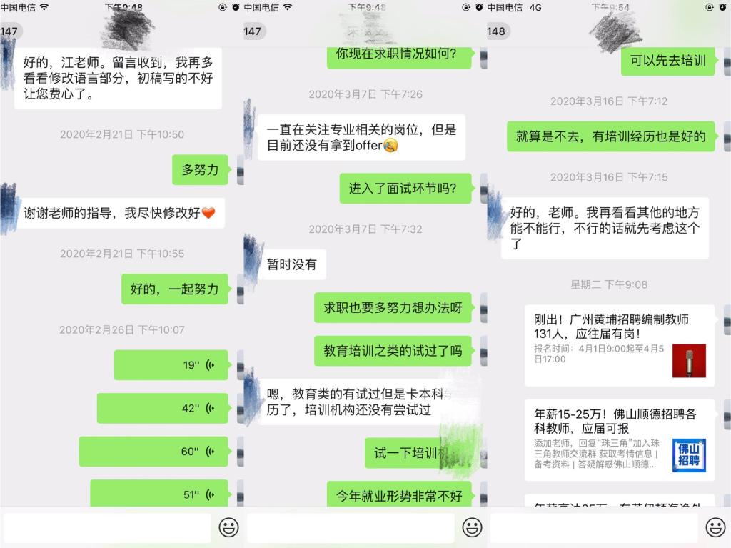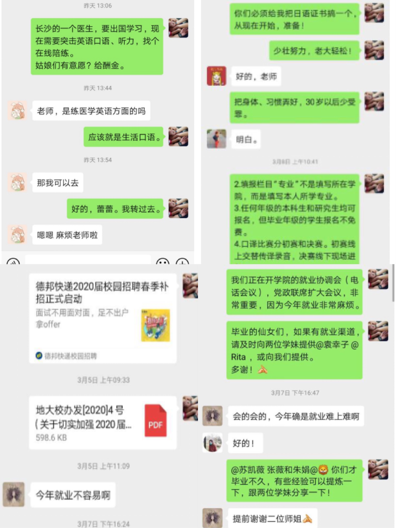 除学校和sunbet申搏官方网站组织的网络双选会、空中宣讲会以及在线面试之外,导师们也都通过多种途径主动跟进毕业生就业意向、就业动态,不遗余力地寻找各类就业信息与途径,在自己有限的能力范围内尽最大可能帮助员工解决就业难题。王伟老师和汪卫红老师常在研究生群里发布专业相关招聘和培训信息。李孝奎老师通过电话与自己的研究生进行沟通,与研究生召开定期例会,就文献阅读,科研探索和实习实训等话题进行交流和指导。李老师今年的毕业研究生方同学面临着初步入职协议保底、签订意向协议、备战公务员考试等几种选择,目前疫情造成不少工作停滞,李老师在员工迷茫时常给予鼓励和建议。